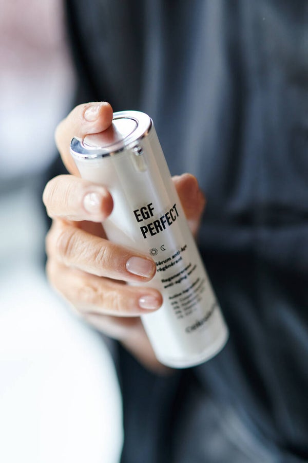 Het anti-aging serum met hyaluronzuur en groeifactoren, EGF PERFECT gecombineerd met MICRONEEDLER, om de collageenproductie en het celherstel te stimuleren.