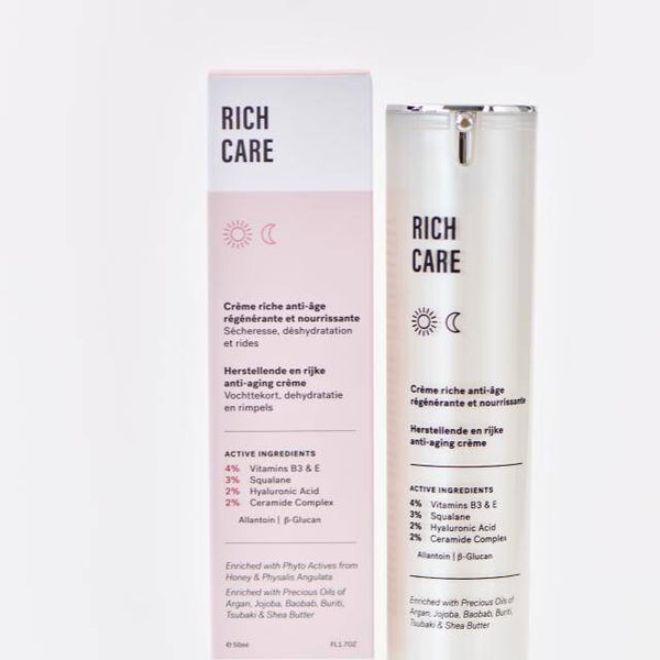 Ontdek onze nieuwe rijke, verzachtende en herstellende moisturizer. De Rich Care voedt de huid intens in de diepte en herstelt de optimale hydratatie. Herstelt de huidbarrière en herstelt de hydrolipidenfilm van de huid. Verzacht irritatie en roodheid . Rijk aan antioxidanten, maakt gelaatstrekken glad, vermindert tekenen van veroudering en beschermt tegen omgevingsinvloeden.